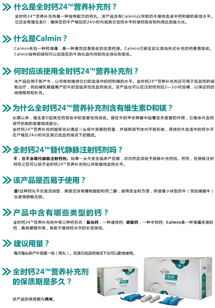 全時鈣24?營養補充劑是一款與眾不同的鈣劑產品。每劑含100g鈣,是鈣含量非常高的產品。包含有快速釋放型鈣——氯化鈣,能夠迅速被瘤胃壁吸收。另一部分組分是Calmin,是一種易吸收的鈣鎂化合物,對于鈣的吸收調節有著重要的促進作用。再加上能夠促進小腸對鈣主動轉運的維生素D,使得全時鈣24?能夠在相當長的時間內給奶牛不斷提供充足的血鈣。通過這些獨特的組分,全時鈣24?能夠給新產?;蚱渌扁}奶牛提供長達24小時的充足血鈣補給。