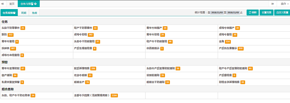 在牧場管理軟件上,管理者可以看到監(jiān)督牛場各項生產(chǎn)任務的通知和對部分管理環(huán)節(jié)的預警,例如斷奶通知、干奶通知、產(chǎn)后配種通知等。這些功能是對到期應開展的具體到牛號的工作任務提醒,以督促相關人員及時準確地執(zhí)行,避免延誤造成損失。