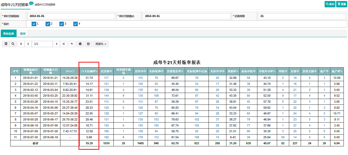 通過指標數(shù)據(jù)對關鍵管理環(huán)節(jié)加以評估和監(jiān)控,并與企業(yè)標準和行業(yè)標準進行對比,根據(jù)數(shù)據(jù)的差異可以幫助管理者及時發(fā)現(xiàn)問題,防微杜漸,以保證牧場的生產(chǎn)經(jīng)營持續(xù)、穩(wěn)定、健康地發(fā)展,如21天妊娠率的指標監(jiān)控。下圖是奶業(yè)之星?牧場管理信息系統(tǒng)對牧場21天妊娠率的監(jiān)控數(shù)據(jù)。