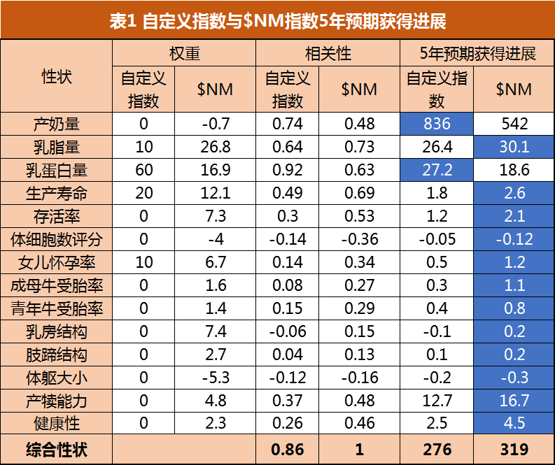 那么,自定義指數(shù)是實現(xiàn)更快遺傳進展和群體盈利能力的最好方法嗎?許多牧場主相信——如果選擇的性狀集中在一個或者極少數(shù)性狀上,那么牛群遺傳進展會更快。但是,許多性狀都會影響到牧場的實際盈利能力,自定義指數(shù)可能會忽視相關性狀對遺傳價值的影響,導致高估或低估一些特定性狀的價值。本文主要針對自定義指數(shù)存在的錯誤觀點以及可能產(chǎn)生的后果進行說明。制定自定義指數(shù)時很容易忽略遺傳性狀之間的相關性,隨著時間的推移,這可能對群體遺傳進展產(chǎn)生重大影響。為了說明這一點,在2018年8月出版的$NM修訂版中,用各個性狀之間的相關性和遺傳進展公式創(chuàng)建了一個電子表格,當改變某個性狀的權重時,電子表格可以預測預期的性狀遺傳進展。假設一個牧場主要關注牛奶中的蛋白質(zhì),自定義指數(shù)時就可以對蛋白質(zhì)設定一個相當大的權重,只給乳脂量少許的權重;同時,這個牧場還重視奶牛的健康性狀,那么就需要集中在女兒懷孕率和生產(chǎn)壽命上。因此,這個牧場的自定義指數(shù)權重為60%的蛋白質(zhì)、10%的脂肪、20%的生產(chǎn)壽命和10%的女兒懷孕率。這個指數(shù)非常簡單,緊緊地集中在幾個最重要的性狀上面。表1顯示了自定義指數(shù)($Cust)和$NM指數(shù)各個性狀的權重、相關性和預期遺傳進展的比較,藍色部分為各個性狀在5年后獲得遺傳進展的優(yōu)勢。