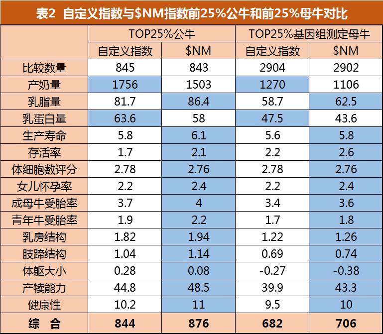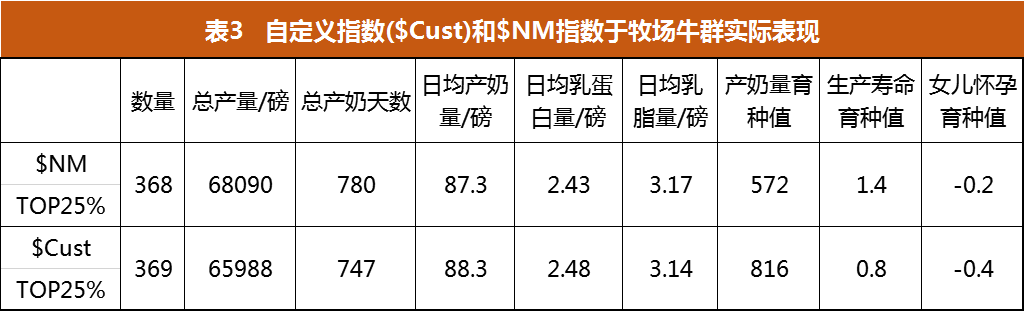 為了可以進一步了解自定義指數(shù)和$NM指數(shù)在實際牧場中表現(xiàn),在2017年美國一家牧場對約1500只母牛進行了回顧性分析。使用父母平均值用以計算每頭奶牛的自定義指數(shù)($Cust)和$NM指數(shù)。表3顯示了兩個指標前25%的母牛各個性狀的實際表現(xiàn)和遺傳育種值。很有意思的是,自定義指數(shù)的群體平均產(chǎn)奶時間減少了33天。