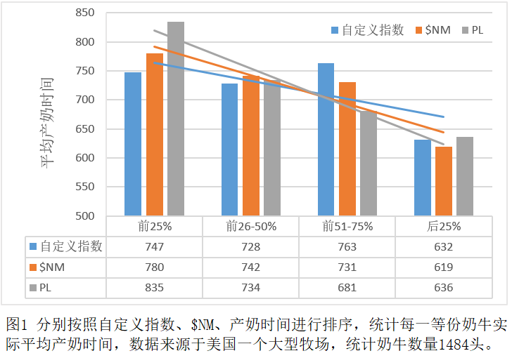 當對群體中所有牛群按照四等分進行比較時,兩種選擇指數(shù)與奶牛的平均產(chǎn)奶時間產(chǎn)生了較大的差異,使用$NM指數(shù)與平均產(chǎn)奶時間的線性趨勢更加一致,這表明$NM指數(shù)對奶牛的產(chǎn)奶壽命指向性更好。(圖1)